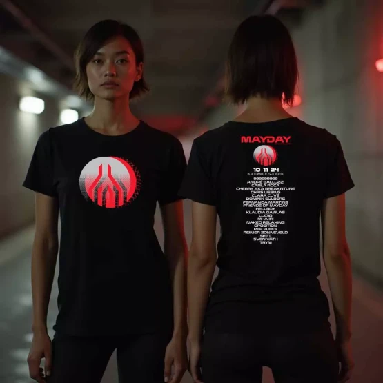 Minimalist form, maximum energy.The red MAYDAY logo pulsing at the center symbolizes the rhythm that drives the night.For those who live to the beat.